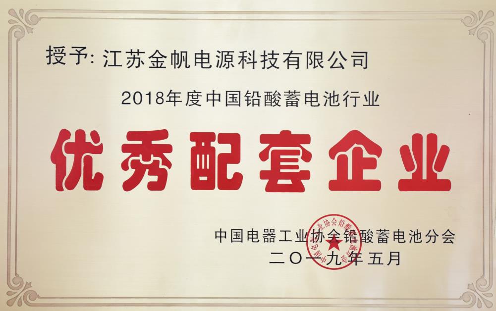 金帆电源科技有限公司“荣获2018年度中国铅酸蓄电池行业优秀配套企业”。