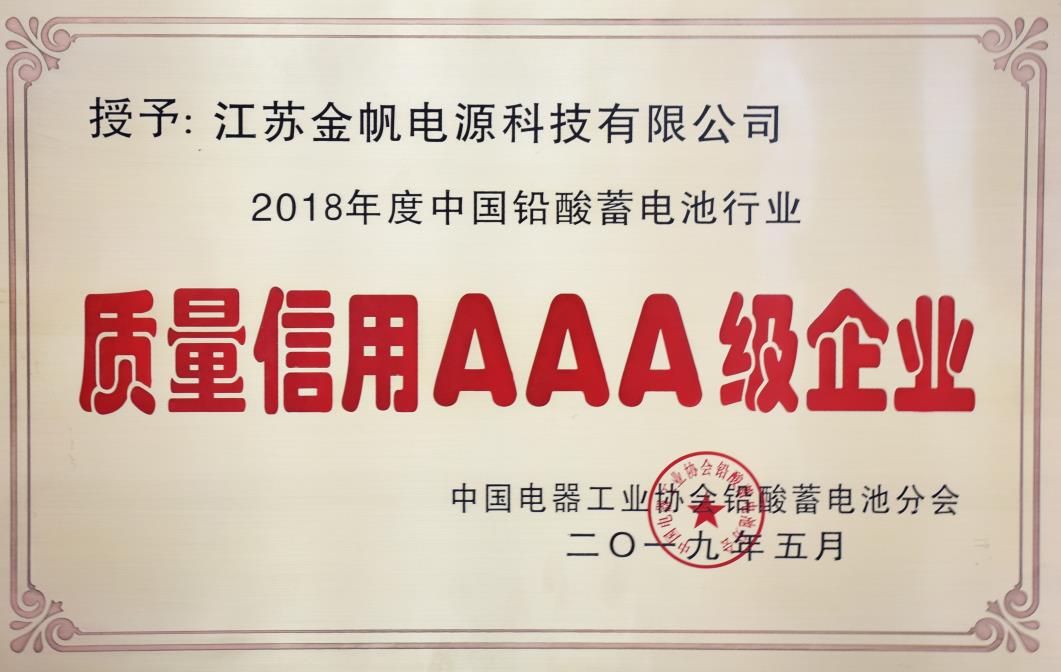 金帆电源科技有限公司“荣获2018年度中国铅酸蓄电池行业质量信用AAA级企业”。