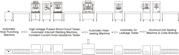 | For motorcycle battery assembling and testing.This line is composed of hole punching machine, short-circuit tester, intercell welding machine, resistance tester, heat-sealing machine, air leakage tester, aluminum-foil sealing machine, code brander and gravity roller and so on. It has features of proper structure, easy operation and high efficiency. Productivity: 120-250 pcs / h (take 12V/7AH battery for example). |