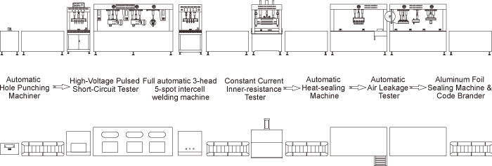| For Automobile battery assembling and testing. This line is composed of hole punching machine, short-circuit tester, intercell welding machine, resistance tester, heat-sealing machine, air leakage tester, aluminum-foil sealing machine, code brander and gravity roller and so on. It can auto convey batteries. PLC can auto control assembly process and take on-line test to push out unqualified batteries, which guarantees high quality of battery assembly. Productivity:100-180 pcs / h (take 12V/65AH battery for example). |